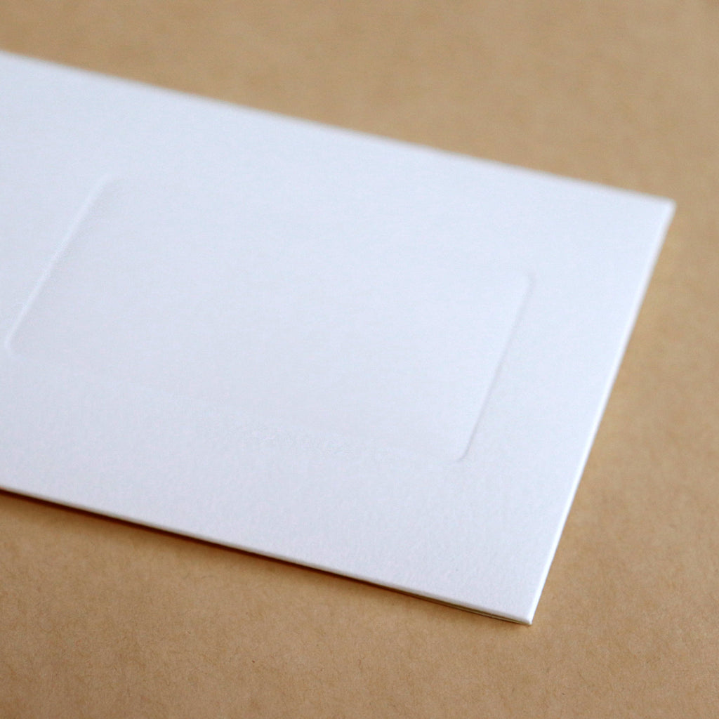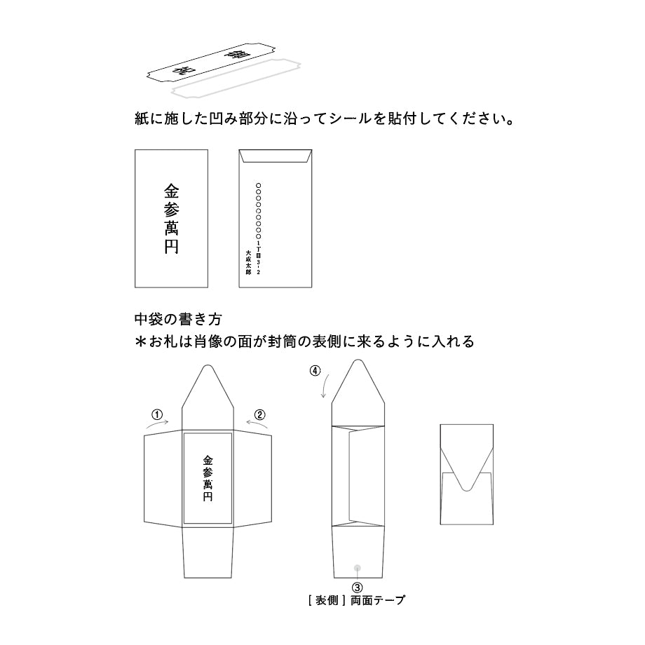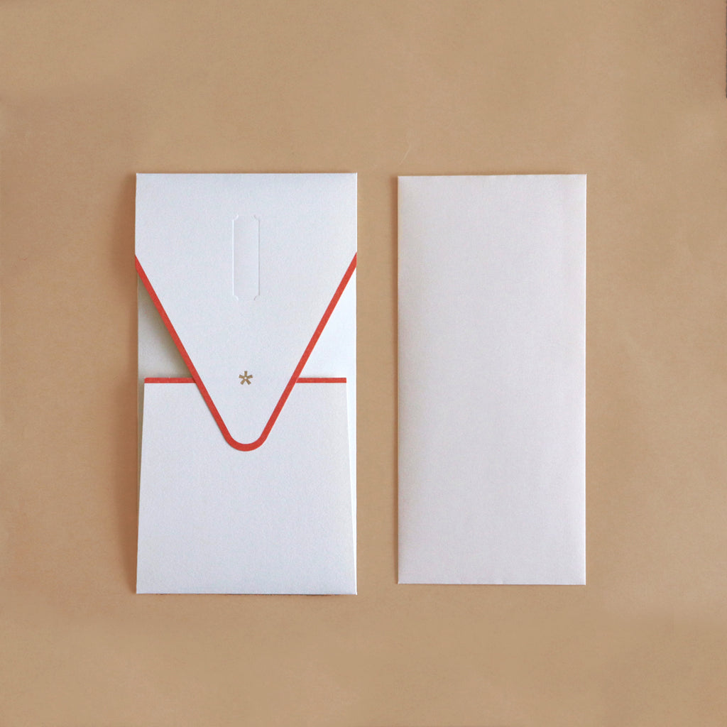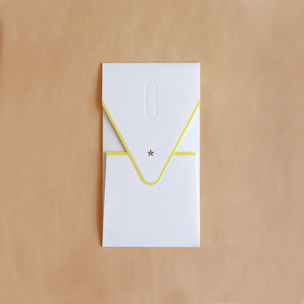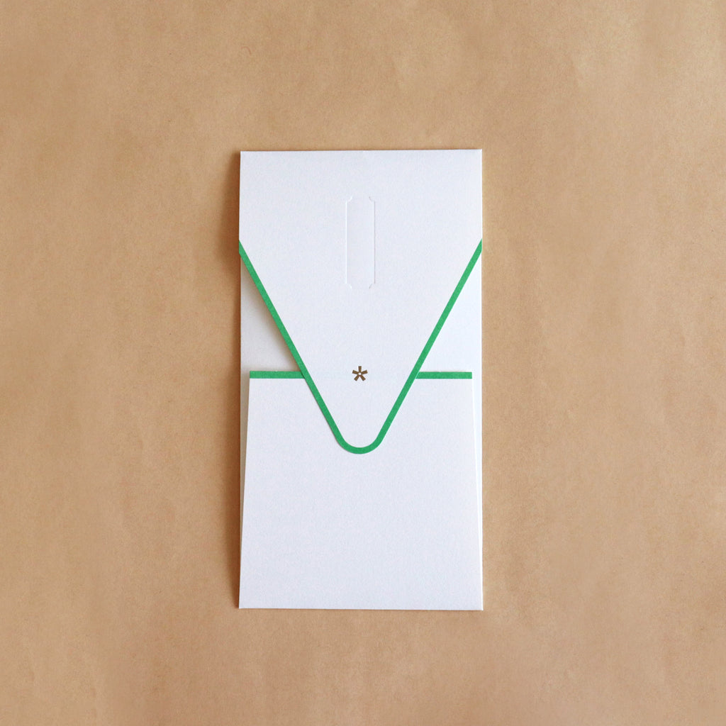 潔く上品な佇まいの祝儀袋。結婚祝い、入学や卒業のお祝い、快気祝いなどさまざまなお祝いのシーンで活躍します。紙器設計の技術でできた形とアクセントカラーが心地よく、付属の「御祝」、「寿」シール、名前を記入できるシールは、紙自体に凹みをつけるデボス加工によって緩やかにガイドされています。