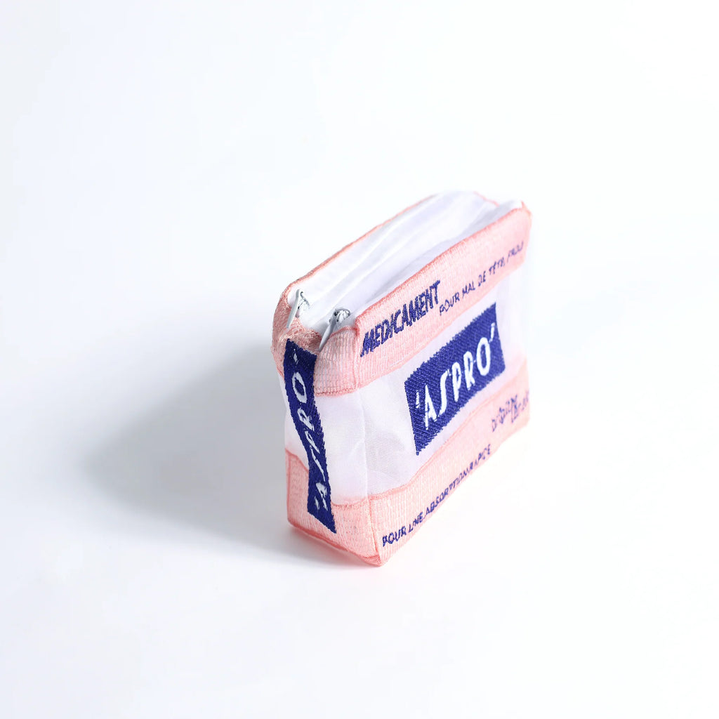 ASPRO POUCH「Aspro」のロゴが刺繍されたポーチ、お薬を入れるためのポーチです。朝、昼、晩と飲み分けができるように三つの仕切りとチャックがついています。Size : 2 x 7 x 5cm