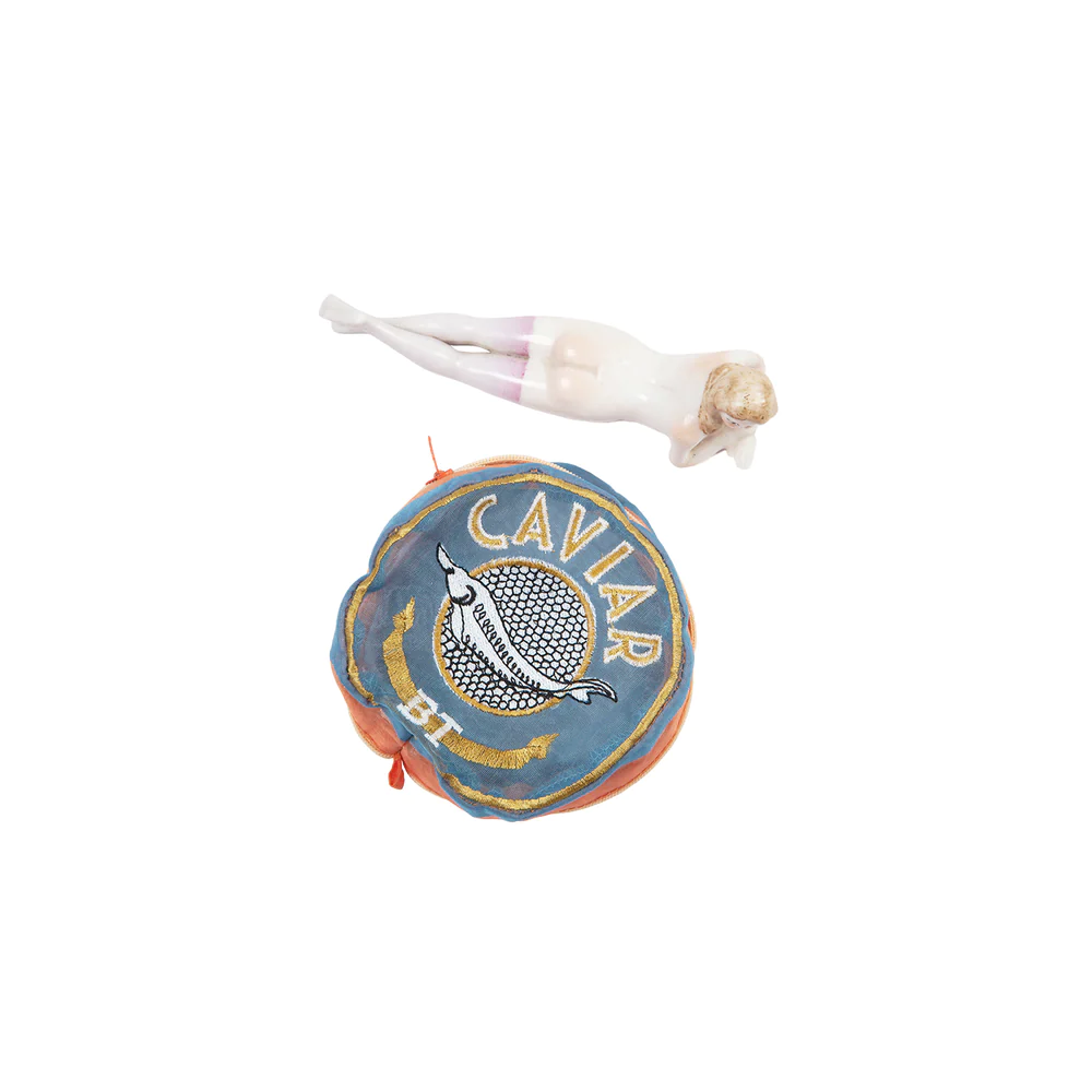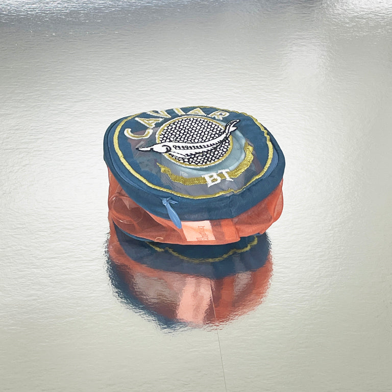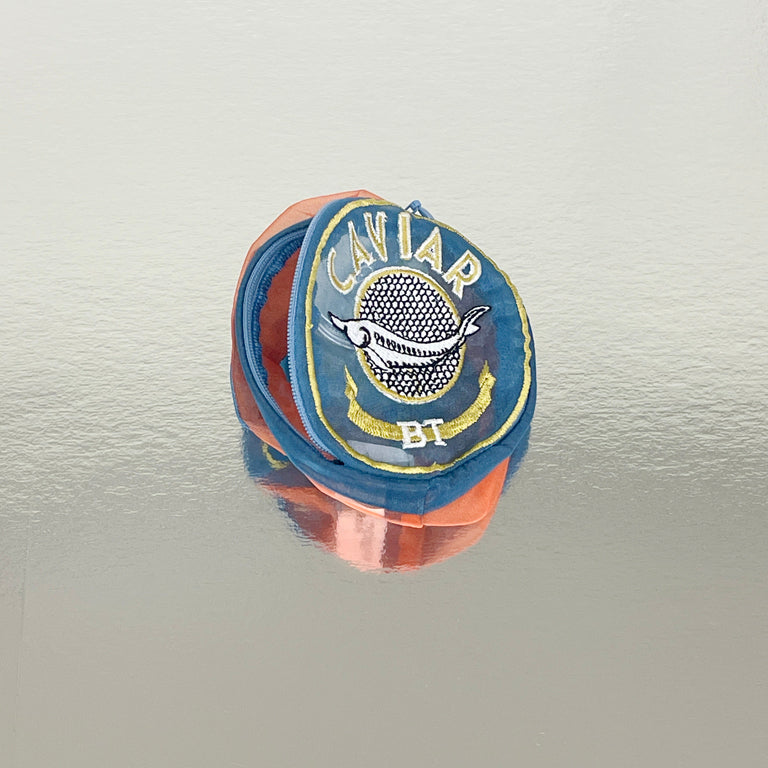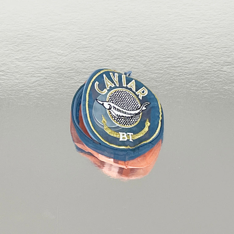 CAVIARキャビア缶のようなデザインのポーチ。お化粧道具や小物が整理できます。蓋部分のzipはまるで缶を開けるように上部のみ開きます。Size : 9cm x 9cm x H4cm